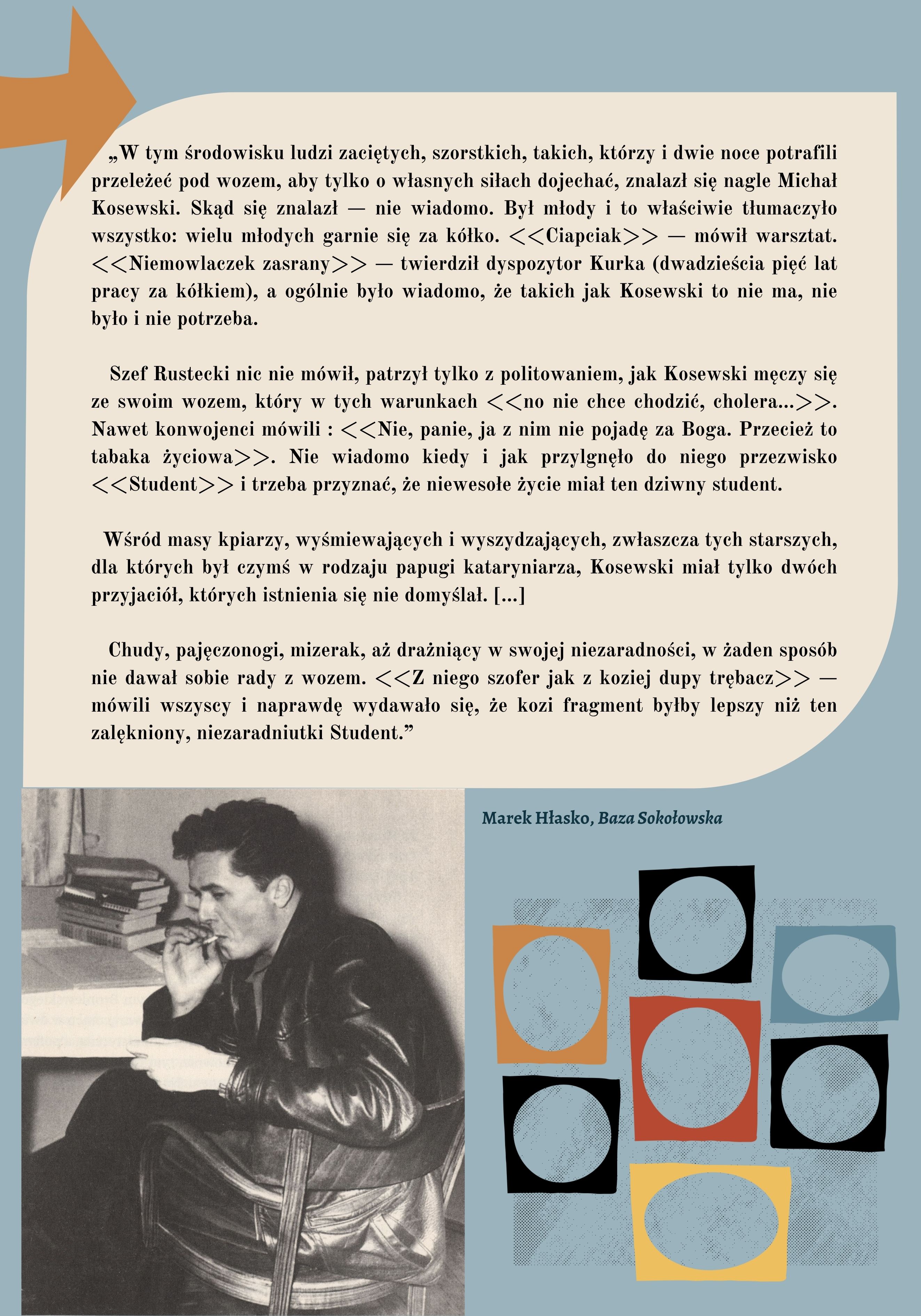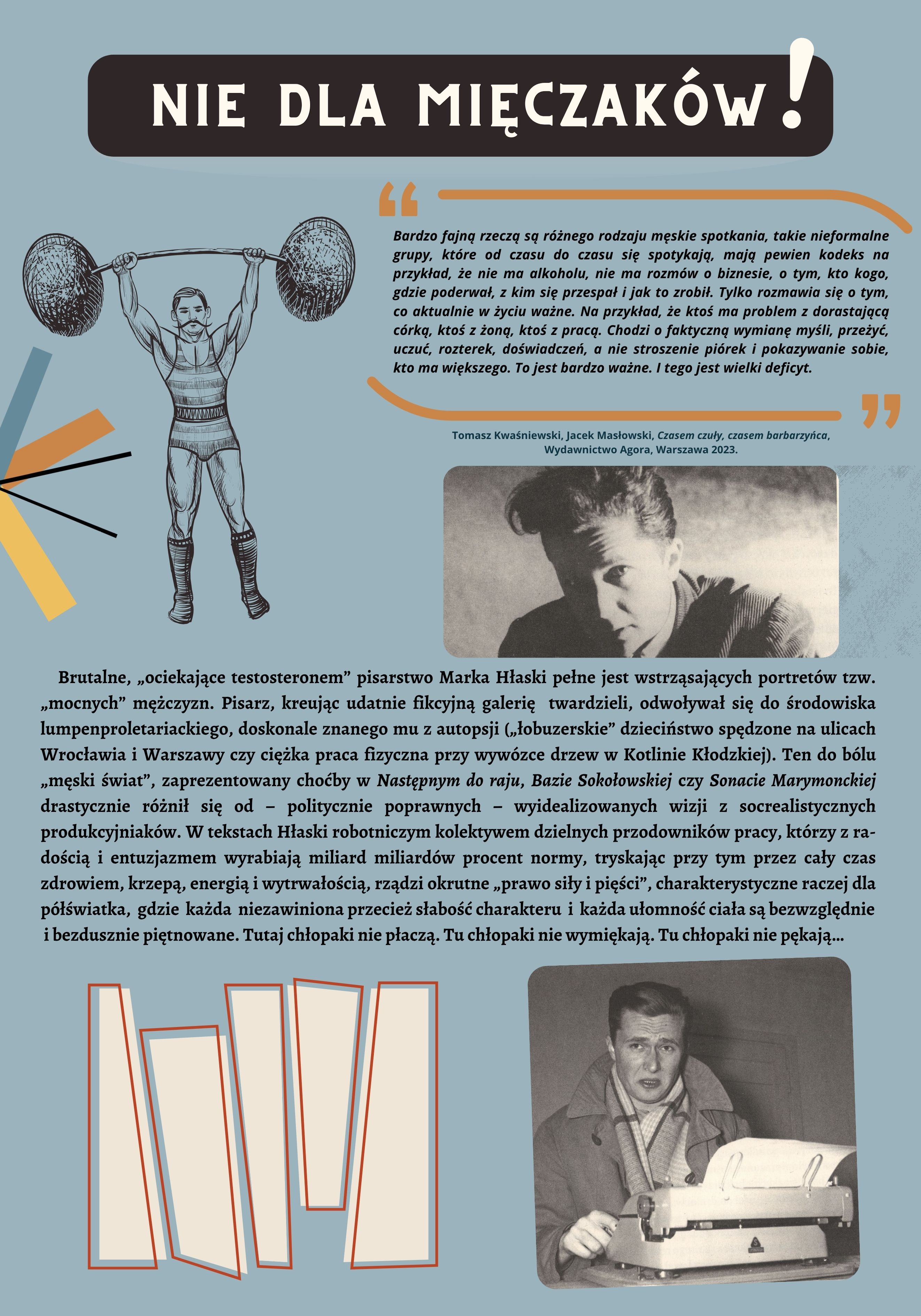 Uznawszy niekwestionowane, w pełni zasłużone miejsce Marka Hłaski w panteonie wielkich polskich pisarzy, musimy jednocześnie z przykrością stwierdzić, że – niestety − ta skądinąd świetnie napisana proza po wielu latach „źle się zestarzała” z uwagi na prezentowaną w niej – mocno „przeterminowaną” – patriarchalną wizję męskości, którą zresztą ucieleśniał w prawdziwym życiu sam prozaik, często kreujący się na tough guy’a rodem z amerykańskich westernów, tudzież kryminałów. Drwiące spojrzenie, zmarszczone czoło, usta wygięte w ironicznym grymasie z nieodłącznym papierosem… Trochę Bogart, trochę Brando, a trochę Dean… Ikoniczny, znany z rozlicznych fotografii i ciut kiczowaty image Hłaski to zdecydowanie wizerunek prawdziwego, „cholernie dziarskiego”, lecz nierzadko również chamskiego faceta, nie potrzebującego głębszych uczuć, „młodego gniewnego”, który tak w Polsce, jak i za granicą nieustannie „łajdaczył się całą gębą”, „kosił baby jak ułan”, „chlał dobrze” i „chuliganił”, często krzywdząc przy tym innych. Dzisiaj nasuwają się nam pytania, czy pisarz całkowicie utożsamiał się z narzuconą mu − także przez ówczesne normy kulturowe − rolą? Czy sam nie był jednak ofiarą patriarchatu? A jeśli tak, to czy próbował w jakikolwiek sposób z opresyjnego systemu się wyzwolić – zarówno w swojej twórczości, jak i w życiu? I czy racji nie miała przypadkiem Agnieszka Osiecka (jedna z wielu kochanek prozaika), gdy twierdziła, że „Marek nie jest tak złym chłopakiem, na jakiego pozuje”?
