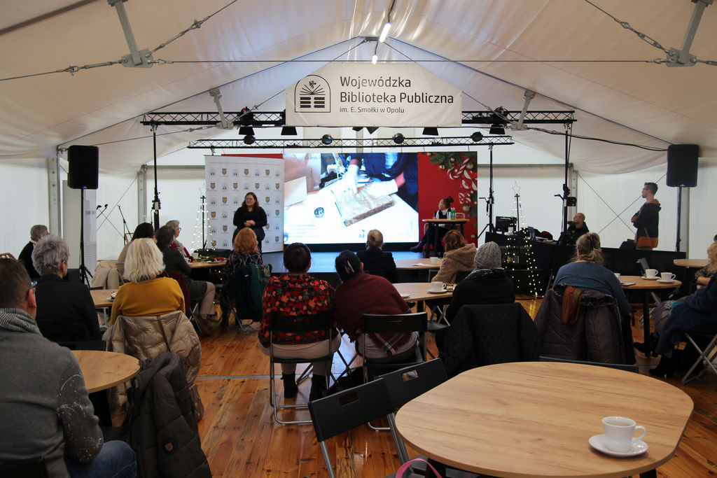 Temu wydarzeniu towarzyszyły prezentacje przygotowane przez autorkę wystawy, Panią Mirosławę Koćwin - kustosz zbiorów zabytkowych WBP w Opolu oraz przez Panią Monikę Karwowską-Gorek - konserwatorkę dzieł sztuki z Warszawy.